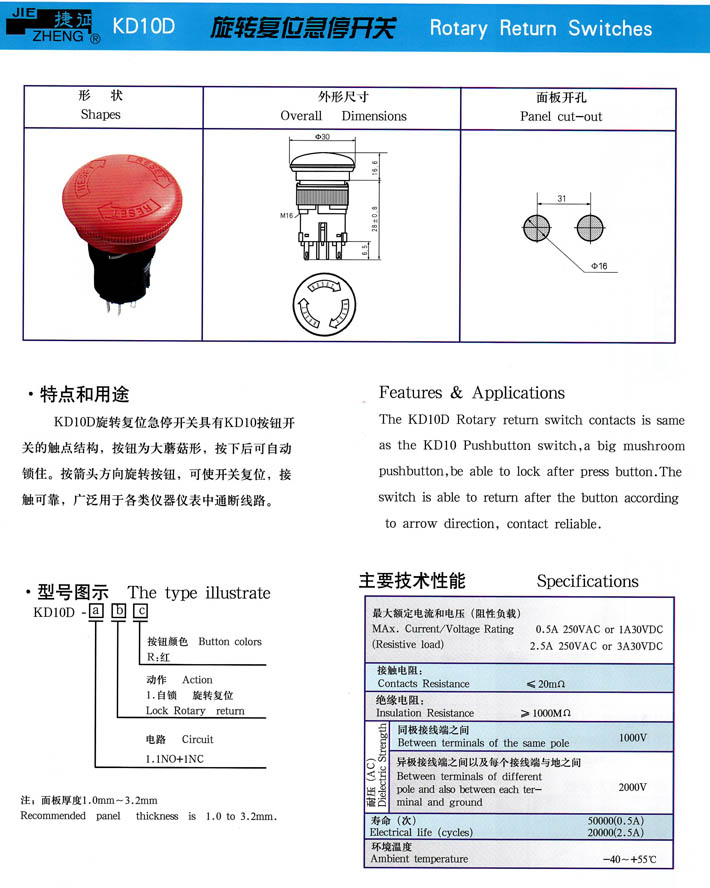 • KD10D旋轉(zhuǎn)急停復(fù)位開關(guān) 產(chǎn)品型號(hào):KD10D